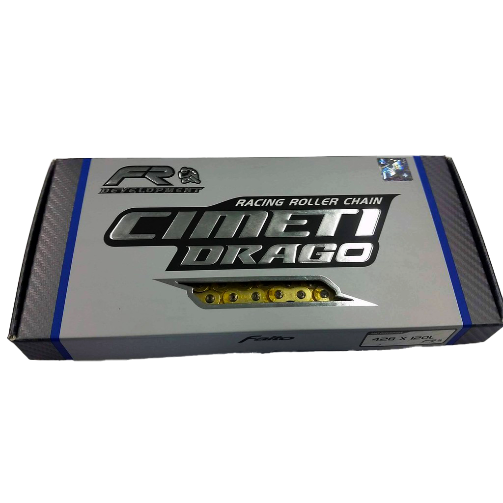 Cimeti Drago is a motorbike wheel drive chain designed and manufactured in Europe, using quality steel from Europe. The connection between the links in the chain (link) uses a rivet system so that the chain does not easily stretch or break. You are free from the activity of tightening the chain up to 15,000 Km. The surface finishing of the chain uses “gold anodized” technology so that it presents a natural and smoother gold color.